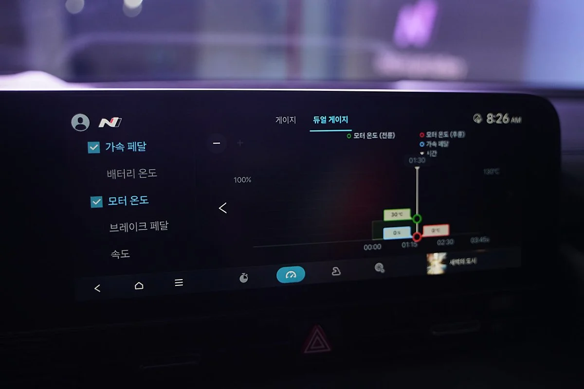 전기차에서는 느낄 수 없었던 운전의 재미 요소 중 하나가 바로 변속이었습니다. 하지만 아이오닉 5 N을 통해 고성능 전기차에서도 변속 충격을 느낄 수 있게 됐습니다. 모터 제어를 통해 고성능 내연기관 차량과 유사한 변속감을 느낄 수 있죠. 이와 연동된 가상의 엔진 RPM과 기어단이 클러스터에 표시돼 직관적이고 재미있는 주행 감각을 제공합니다.