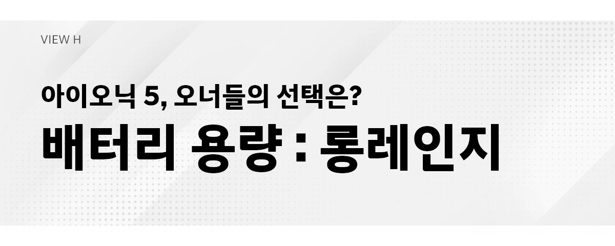 이외에도 롱레인지 모델의 경우 20인치 휠이 적용된 모델과 AWD 모델들은 모든 모델이 400km 이상의 1회 충전 주행거리를 기록했습니다. 스탠다드 모델과 롱레인지 모델의 주행 거리가 차이를 보이는 만큼 아이오닉 5를 구매한 오너들의 대다수는 롱레인지 모델을 선택했습니다.