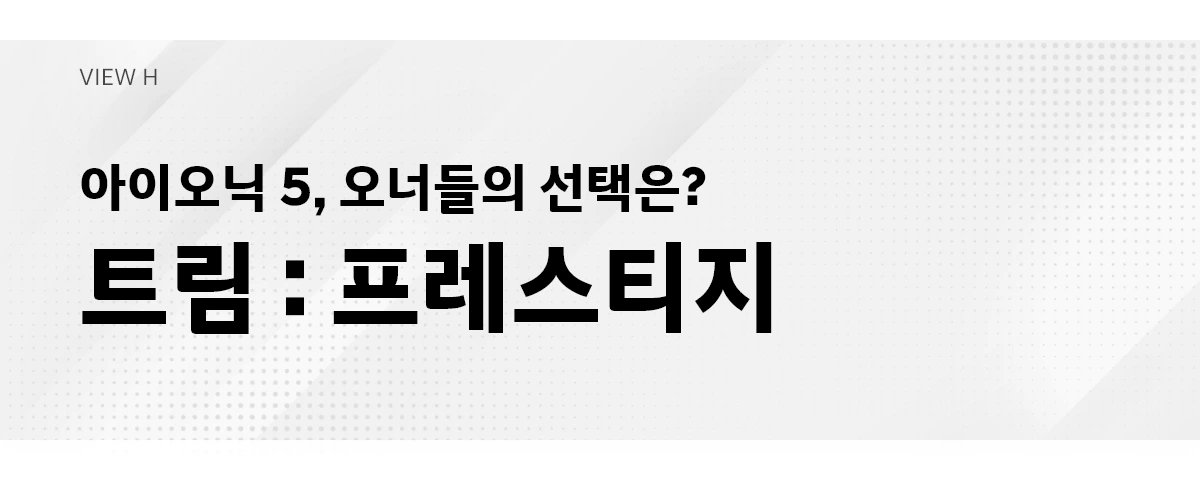 익스클루시브, 프레스티지, 이-라이트 에이치트랙 등 세 가지 트림 중에서 오너들이 가장 많이 선택한 트림은 아이오닉 5의 구매한 소비자 중에서 59.4%가 선택한 프레스티지 트림이었습니다.