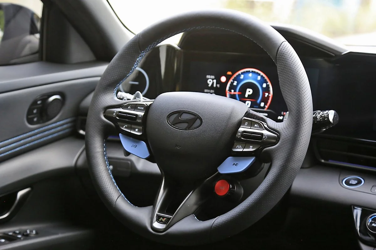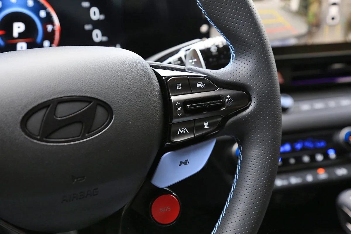 이번 더 뉴 아반떼 N은 스티어링 휠 중앙에 적용된 현대자동차 엠블럼이 평면 형태로 변경됐고 색상도 은색에서 검은색으로 바뀌며 스티어링 휠의 분위기도 소폭 변경됐습니다. 이 밖에도 블랙헤드라이닝, 선바이저, 필라트림 등에 검은색이 적용됩니다. 기어 노브도 더 뉴 아반떼와 형상이 다른 N 전용 기어노브, 메탈 도어 스커프 등도 N 전용 사양들이 적용되며 차별화를 이룹니다.