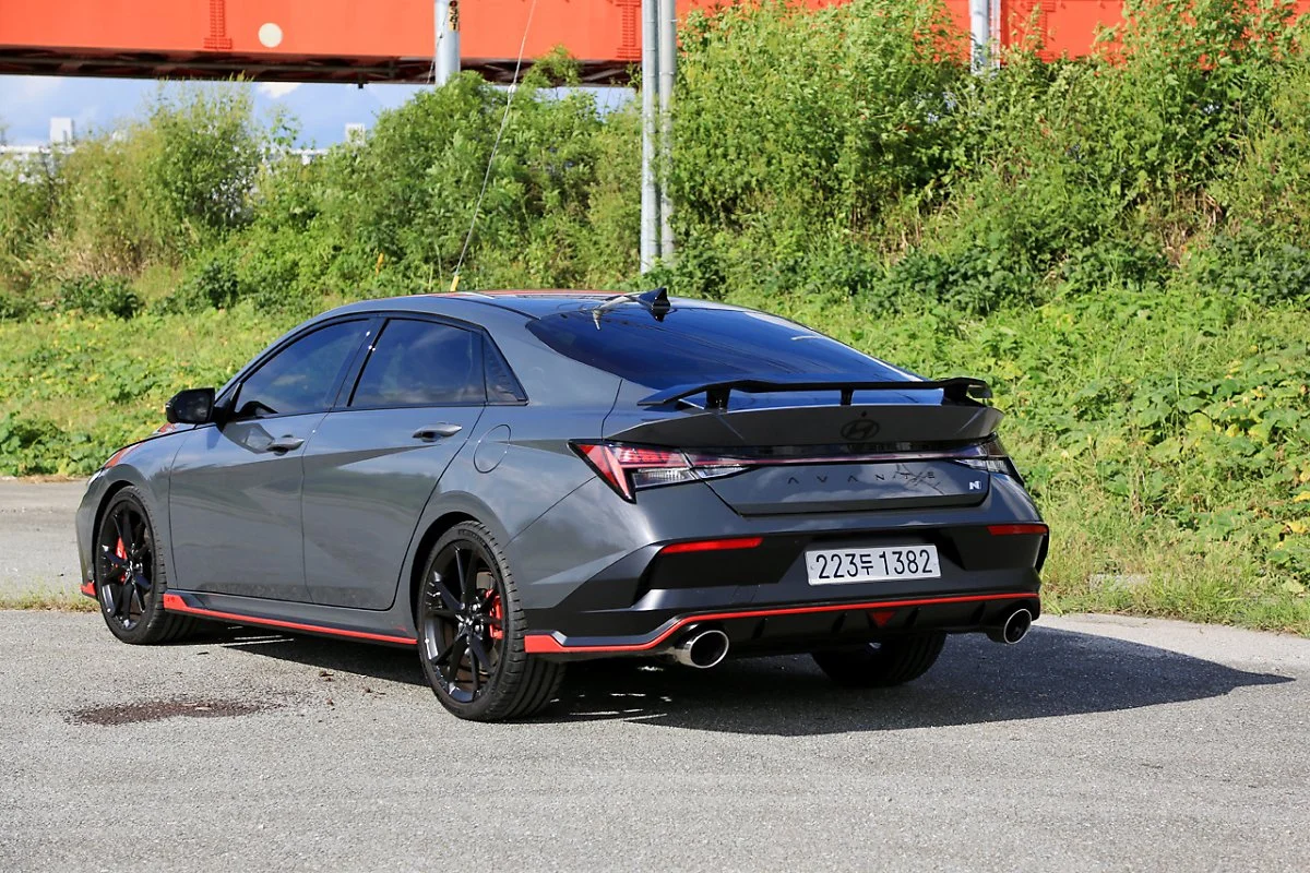 후면은 이번 더 뉴 아반떼 N의 성격을 잘 보여줍니다. 트렁크 상단에는 윙타입 리어 스포일러가 적용돼 멋과 공력성능 모두를 확보했습니다. 적당한 크기의 듀얼 싱글 팁 머플러와 리어 디퓨저, 그 사이에 적용된 역삼각형 리어 리플렉터는 내연기관 N 모델에만 적용되는 디자인 특징입니다. 이를 통해 현대자동차의 고성능 N 모델이라는 것을 강조합니다.