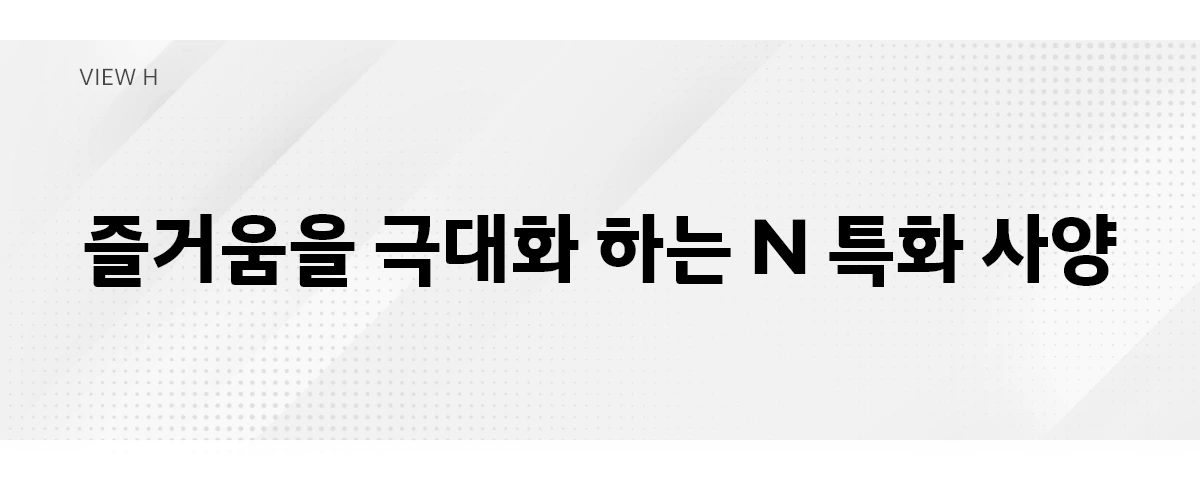 N 전용 모드가 인포테인먼트 시스템도 운전의 재미를 더 해주는 요소입니다. 더 뉴 아반떼 N은 10.25인치의 전자식 계기반과 터치스크린 두 개가 결합된 파노라마 디스플레이가 적용됐습니다. 여기에 더 뉴 아반떼 N 모델에만 적용되는 N 모드는 운전의 재미는 물론이며 주행에 필요한 다양한 정보를 운전자가 쉽게 파악할 수 있게 만들어졌습니다.