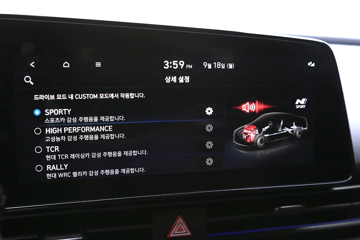 N 전용 인포테인먼트 시스템의 경우 현재 운전자가 브레이크를 밟는 압력, 엔진의 부스트 압력, G 포스 미터, 내부 스피커를 통해 N 모델 특유의 배기음과 역동적인 주행 사운드를 증폭시키고 스포티, 하이 퍼포먼스, TCR, RALLY 등의 다양한 사운드 중 선택할 수 있는 N 사운드 이퀄라이저(NSE), 국내 서킷 정보, N 커스텀 모드 등 주행의 재미를 더해주는 각종 사양들을 선택할 수 있습니다.