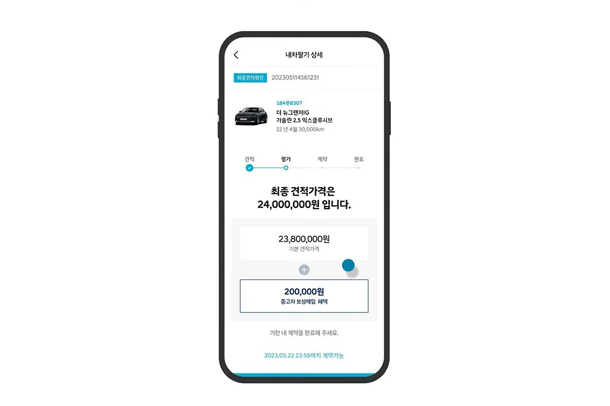 내차팔기 견적이 마음에 든다면, 전자 계약서에 서명을 완료하고 난 후 차량 명의 이전 서류를 준비하면 내 차를 판매할 준비가 완료됐습니다. 자동차 매도용 인감증명서 등, 원본 확인이 필요한 서류의 경우 탁송 기사에게 직접 전달하면 됩니다. 이후 차량 인도가 완료되면 차량 판매대금이 지급됩니다.