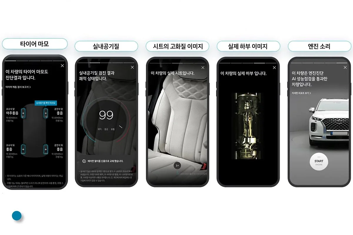 또한 현대/제네시스 인증중고차는 기본적으로 현대자동차는 272가지, 제네시스는 287가지의 세세한 항목을 검사하고 통과해야 인증중고차로 등록이 가능합니다. 또한 기존 중고차 시장에서 세세하게 확인하기 힘들었던 타이어 마모도, 실내공기질, 시트의 고화질 이미지, 차량의 실제 하부 이미지, 엔진 소리 등 등록된 차량의 상세한 상태를 담은 오감만족 카테고리도 제공해 등록된 차량의 상태를 확실하게 공개합니다.