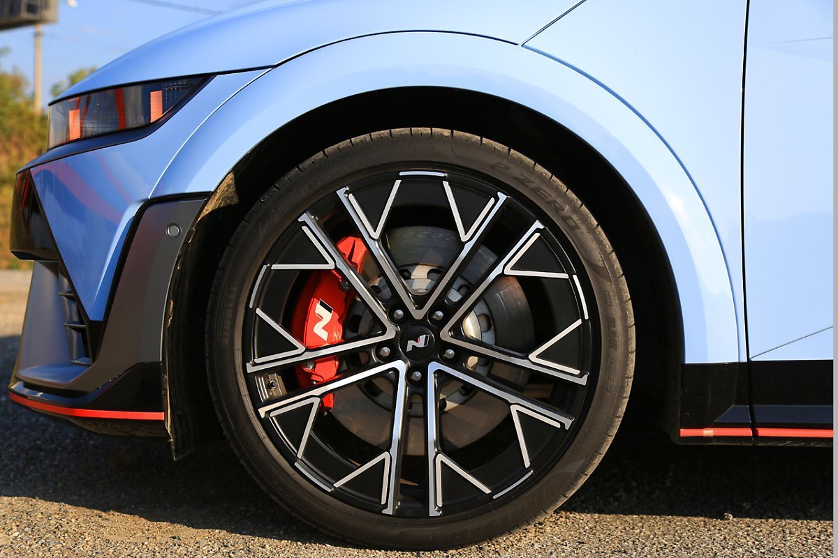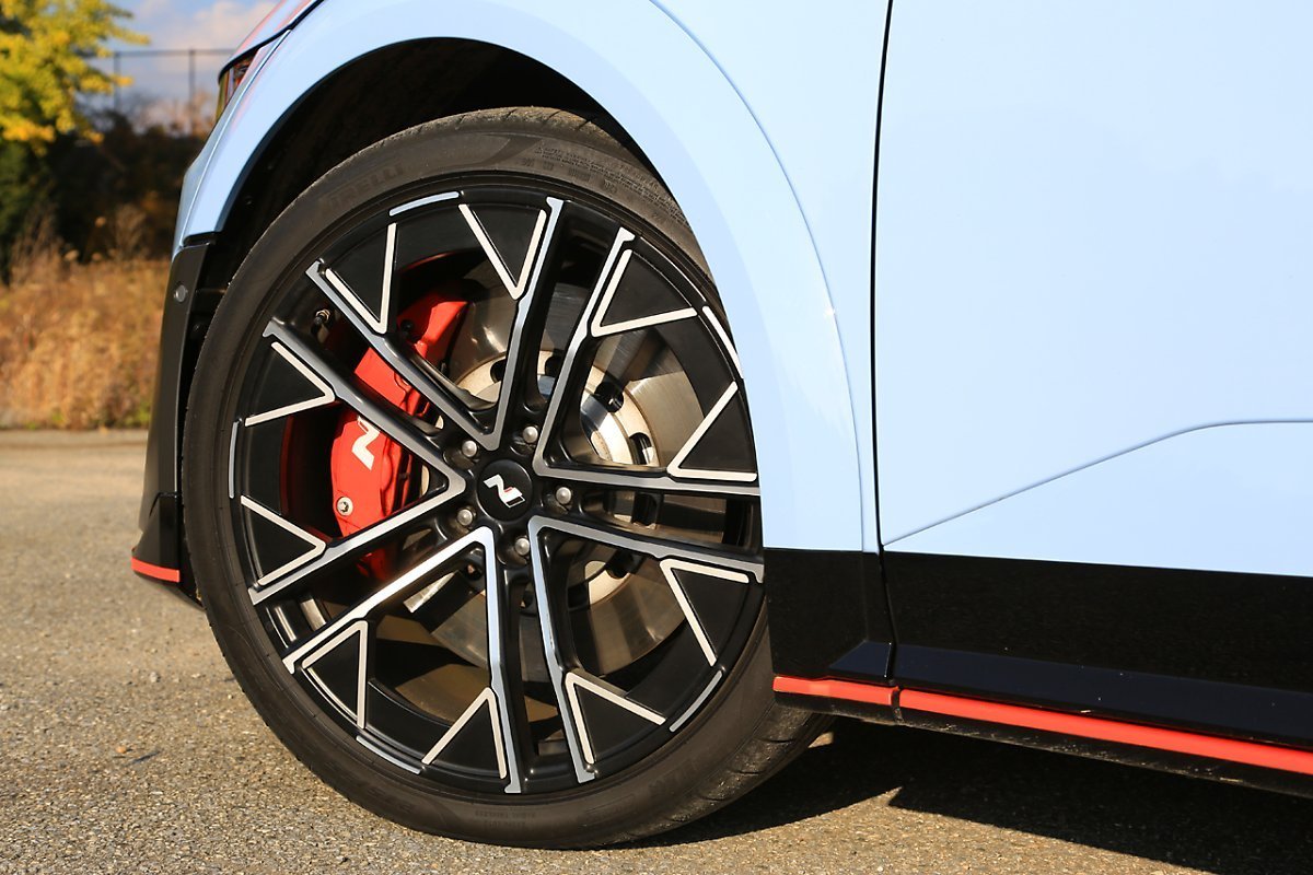 아이오닉 5 N은 일반 모델 대비 전고를 20mm 더 낮췄습니다. 추가로 N 모델 전용 21인치 단조 휠, 전면 범퍼부터 이어지는 N 전용 루미너스 오렌지 스트립을 통해 역동성을 더했습니다. 특히 21인치 휠의 경우 후륜 휠을 전륜 휠 보다 더 입체감 있는 역조 형상으로 제작해 역동성을 더해줍니다.