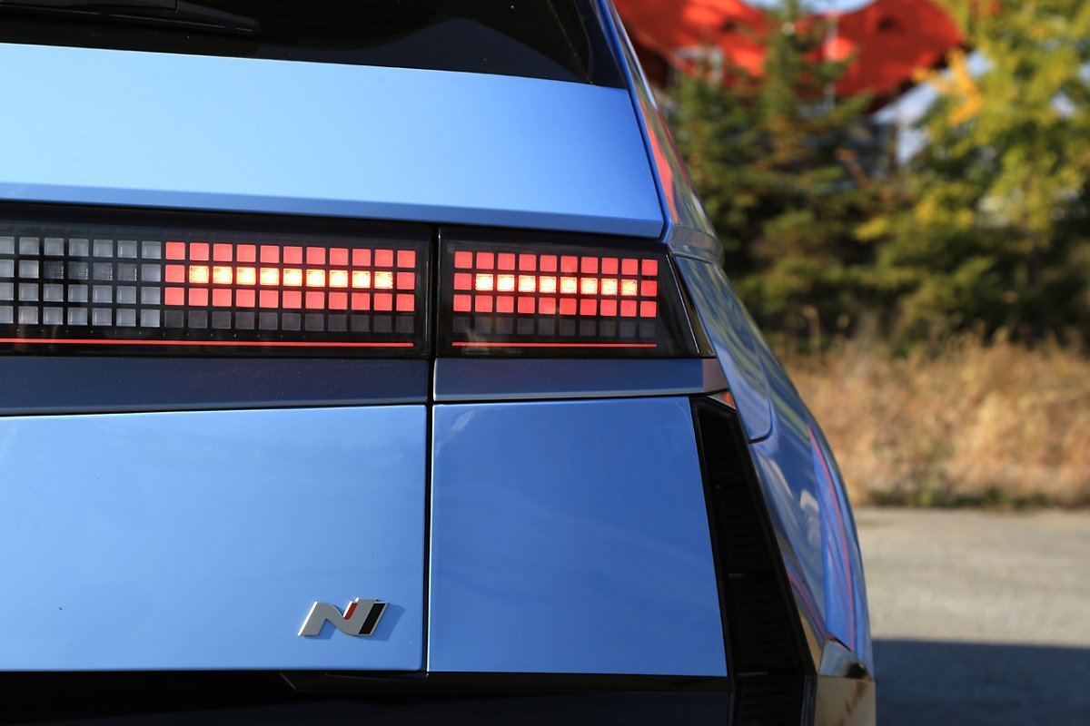 트렁크 상단부에는 일반 모델과 다르게 약 100mm 더 길어진 N 전용 리어 스포일러가 적용됐습니다. 이를 통해 시각적인 만족도와 공력성능도 향상시켰습니다, 내연기관 고성능 차량의 경우 듀얼 머플러 형상을 통해 성능을 강조합니다. 그러나 아이오닉 5 N은 전기차인 만큼 머플러가 존재하지 않아 디퓨저를 통해 성능을 강조했습니다. 디퓨저 위에는 빨간색 체커 플래그 그래픽이 적용된 리플렉터가 눈길을 사로잡습니다.