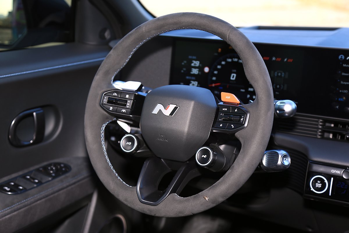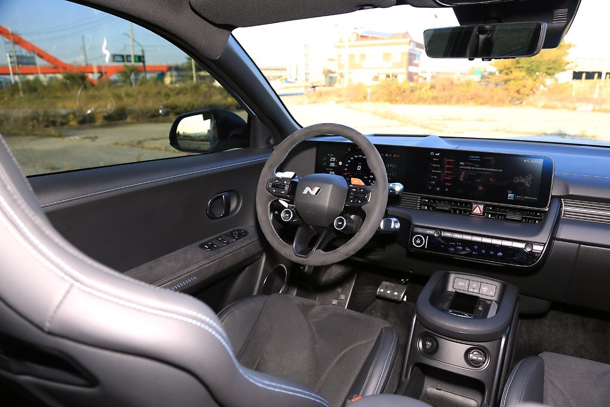 스티어링 휠의 경우 내연기관 N 모델과도 다르며 기본 모델인 아이오닉 5와도 완전히 다른 신규 스티어링 휠이 적용됐습니다. 스티어링 휠 중앙에는 N 이니셜이 새겨져 현대자동차의 엠블럼이 새겨진 내연기관 N 모델과 완전히 다른 분위기를 연출합니다. 또한 NGB, 두 개의 N 커스텀 버튼, 드라이브 모드 변경 버튼, 회생제동과 기어 변속을 겸하는 패들시프트 등이 적재적소에 배치돼 주행 중에도 전방 시야를 놓치지 않고 조작이 가능하도록 했습니다.