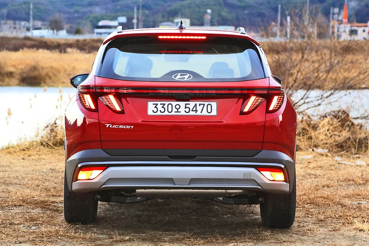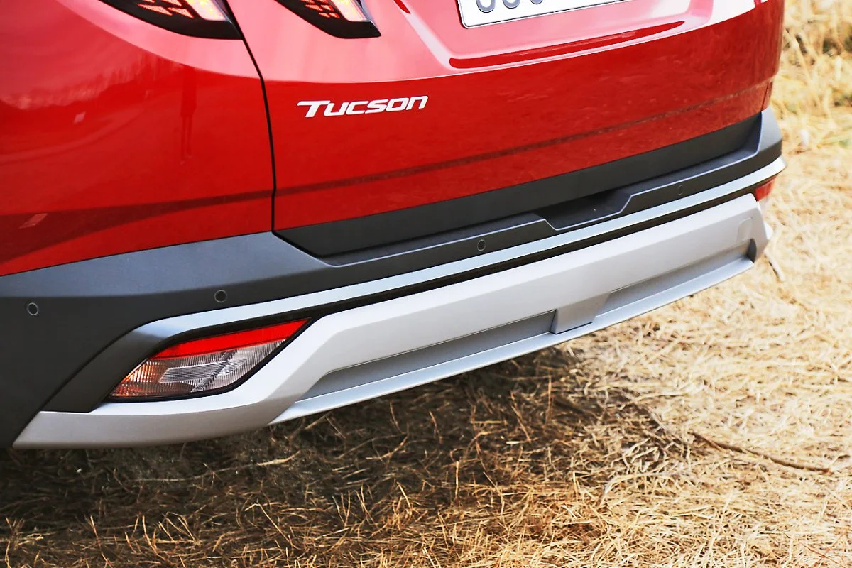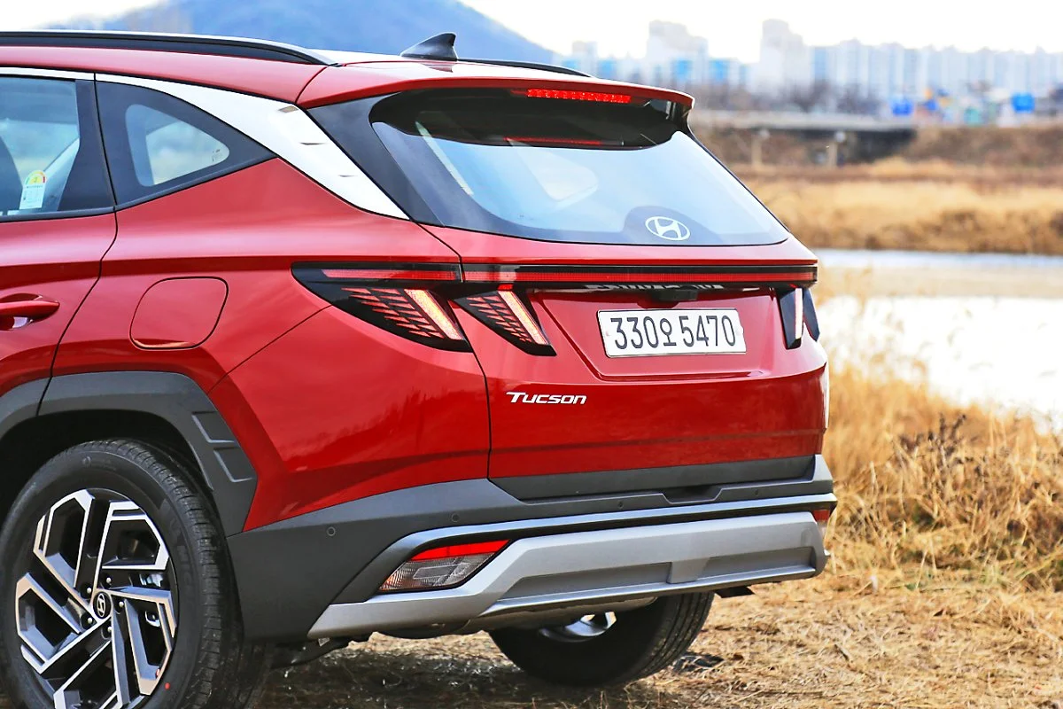 후면부 역시 수평형 LED 램프와 날카로운 느낌의 테일램프 등 기존 투싼의 매력을 그대로 간직하고 있습니다. 여기에 범퍼 형태가 세련되면서도 단단한 형상으로 새롭게 디자인됐습니다. 범퍼 몰딩과 일체화를 이룬 스키드 플레이트는 가로 폭을 늘려 전면부와 마찬가지로 차폭을 강조하는 와이드한 이미지로 거듭난 것이 특징입니다.