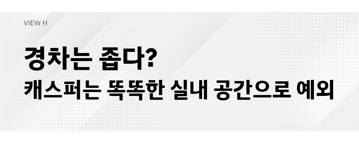 캐스퍼는 현대차가 국내에서 처음 선보이는 경형 SUV로써 국내 경차 기준에 맞춰 제작됐습니다. 현재는 경차에 대한 규제 완화의 목소리가 나올 만큼 국내 경차 규격은 크기 제한이 엄격한 편입니다. 캐스퍼는 국내 경차 규격에 딱 맞게 제작된 차량이기 때문에 크기만 놓고 보자면 실내 공간이 널찍하다고 할 수는 없지만 캐스퍼는 똑똑한 실내 구성으로 좁은 실내 공간을 알차게 꾸몄습니다.