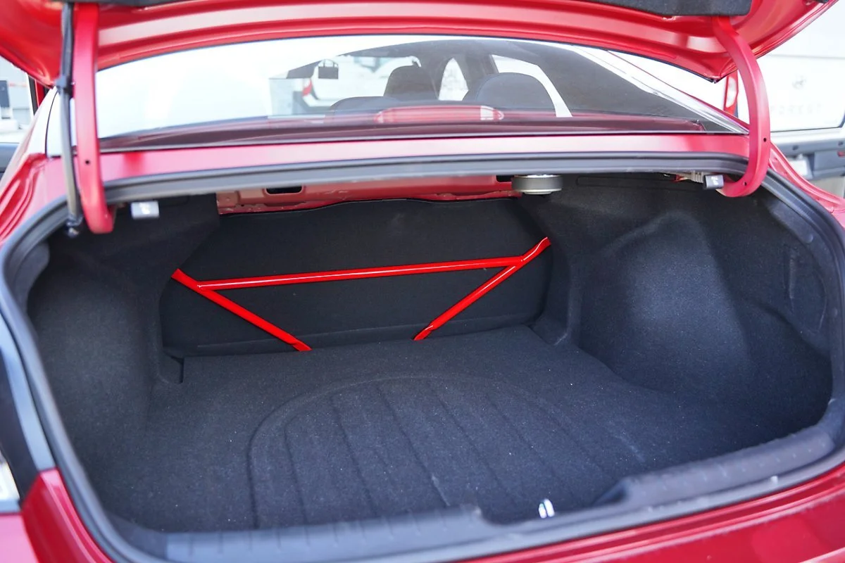 고성능을 발휘하는 만큼 아반떼 N은 탄탄한 기본기를 갖췄습니다. 1.6리터의 가솔린 모델보다 부피도 크고 높은 열을 방출하는 엔진이 적용되는 만큼 후드 상단부와 엔진 뒤편에는 방열판이 더해져 엔진열에 대한 대비도 확실히 했습니다. N 모델은 6:4 폴딩이 적용되지 않지만 벤치 폴딩을 지원하며 빨간색의 리어 스티프 바가 더해져 차체 강성을 높였습니다. 또한 부피가 큰 짐을 적재해야 하는 상황에서는 스티프 바의 제거가 가능한 것도 장점입니다.