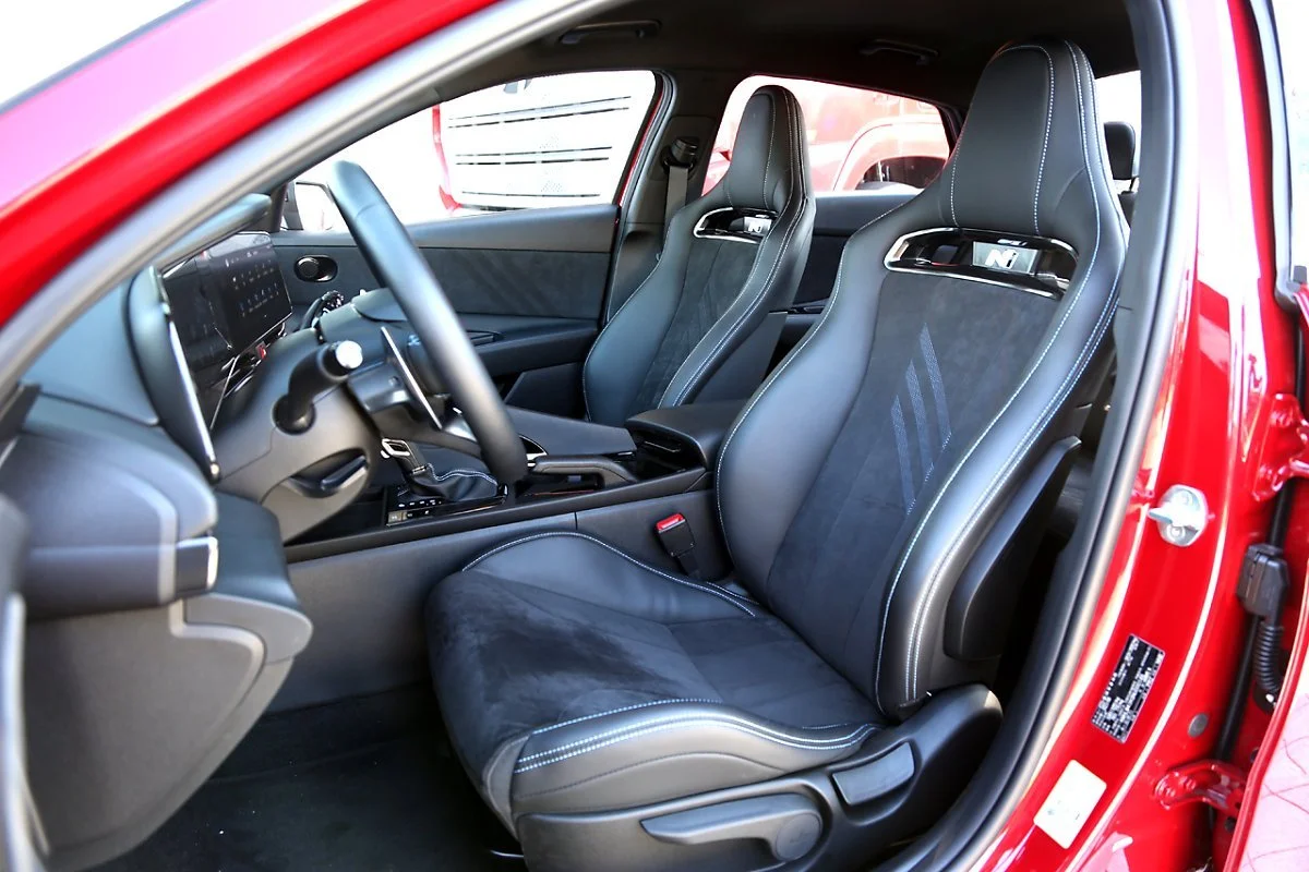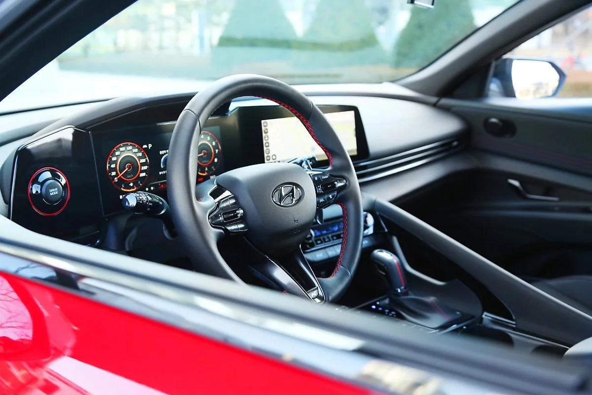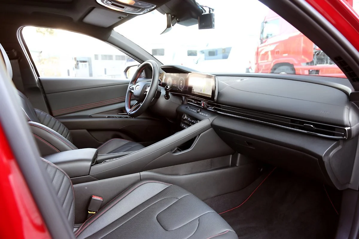 실내에는 퍼포먼스 블루 색상을 사용한 N 모델과 다르게 레드 색상을 사용해 N 모델과 차별화를 이룬 동시에 역동성을 강조했습니다. 기본형 모델과 다른 3 스포크 타입 스티어링 휠이 적용되고 스티어링 휠에는 빨간색 스티치가 적용됩니다. 또한 패들 시프트까지 적용돼 운전의 재미를 강조했습니다.
