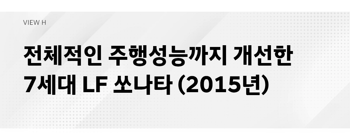 6세대 YF 쏘나타는 배기량 대비 출력비에서 1리터당 100마력을 훌쩍 뛰어넘은 최고출력을 발휘하는 것으로 세계를 놀라게 했습니다. 그러나 2015년 출시된 7세대 LF 쏘나타는 2리터 가솔린 터보 엔진은 최고출력 245마력, 최대토크 36kg.m으로 전작 대비 오히려 수치는 낮아졌습니다. 출력보다 전체적인 성능의 균형을 맞춰 가면서 주행 안정성을 높이는데 집중했기 때문입니다.