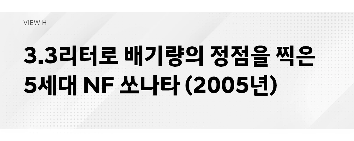 현대차는 2005년, 5세대 NF 쏘나타에 3.3 V6 람다 엔진을 장착한 최상위 모델을 선보이기도 했습니다. 3.3리터 V6 람다 엔진은 현대차에서 개발해서 상위 모델인 그랜저의 최상위 모델에서 장착하던 것으로 최고출력 233마력, 최대토크 31kg.m을 발휘했습니다. 넉넉한 출력을 뒷받침할 수 있도록 자동 변속기 또한 4단이 아닌 5단으로 변경해서 파워트레인을 전체적으로 강화했습니다.