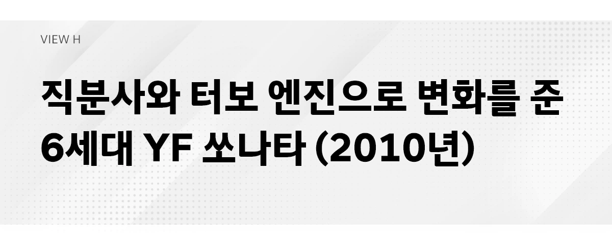 쏘나타는 5세대에서 배기량의 정점을 찍은 뒤, 6세대 YF 쏘나타로 넘어오면서 극단적인 대배기량보다는 2.4리터 가솔린 직분사 엔진을 통해 대중성을 갖추기 시작했습니다. 2010년 당시에는 흔치 않았던 직분사 기술을 통해 2.4리터 엔진은 4세대 동일 모델 대비 최고출력은 35마력 향상된 201마력을 기록하게 되었고, 최대토크도 25.kg.m을 발휘하게 되었습니다.
