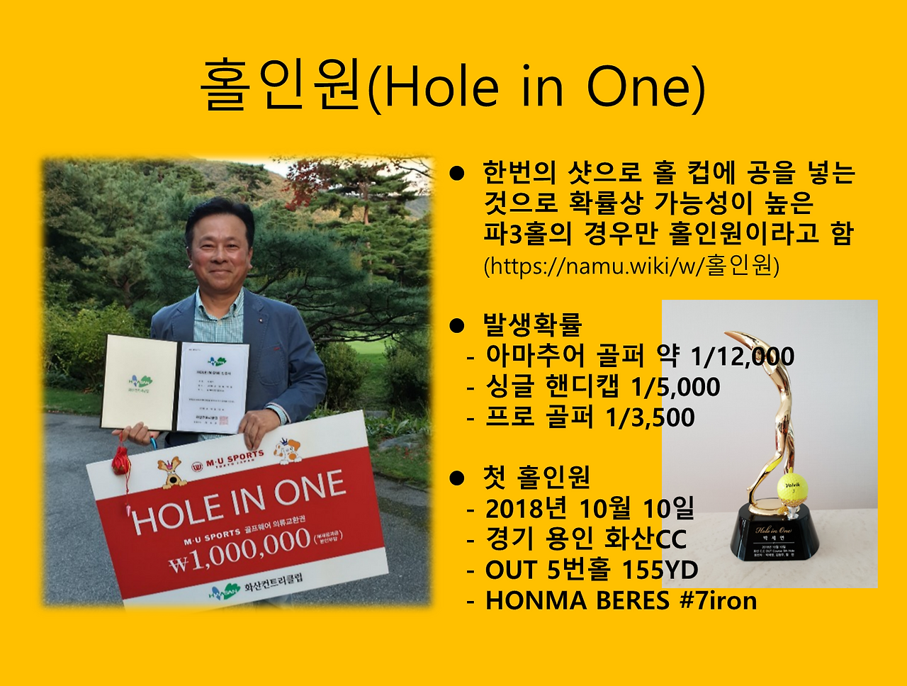 2018년 10월 10일 경기 용인 화산CC에서 생애 처음으로 홀인원을 했다. 홀인원 발생 확률을 고려하면 어느 정도 운이 따라야 한다.