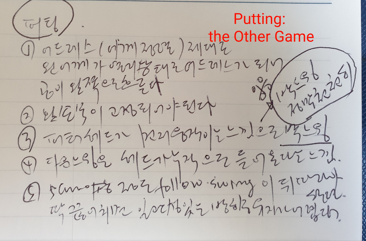 퍼팅 시 공의 직진성이나 타구감이 좋지 않은 경우를 대비해 나에게 필요한 5가지 사항을 메모해 두고 연습그린에서 이를 몸에 기억시킨다.