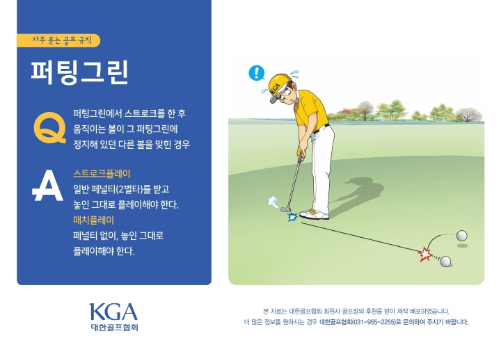 볼이 그린에 올라가면 반드시 마크부터 해야 한다. 특히 중장거리 퍼팅 시 방향이 다르다고 그냥 두는 통에 간혹 2 벌타를 받는 경우가 발생한다.(KGA 홈페이지)