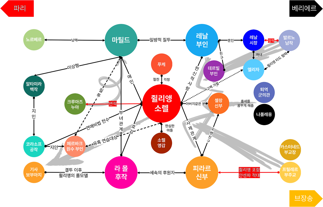 쥘리앵은 자신의 재능과 노력으로 꾸준히 신분을 상승시킨다. 쥘리앵이 가정교사로 일하며 레날 부인과의 사랑을 겪는 고향 베리에르, 수완을 인정받고 수학하던 브장송, 그리고 능력을 인정받고 파리로 옮겨가는 작품의 배경은 꾸준히 상승적인 구도를 그려낸다.