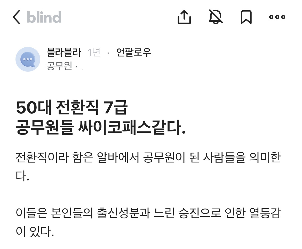 심지어는 자신보다 급수도, 월급도 훨씬 높다고 한다. 일도 본인보다 안 하는 것 같다. 거기에 현재 전환직이 자리하고 있는 급수는 6~7급이다. 이들 때문에 내 승진도 적체가 된다고 한다. 괜히 시험 쳐서 공무원 들어온 것 같다. 상대적인 박탈감이 든다.