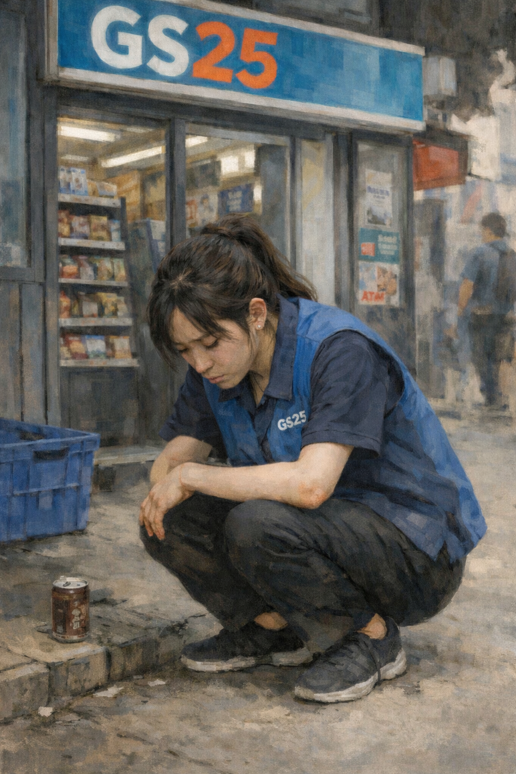 GS25 앞, 젊은 알바 하나가 가게 밖에 쪼그리고 앉아 담배를 피우고 있었다. 누군가는 무심히 지나칠 장면이었으나 나는 걸음을 늦췄다. 저 나이에 무엇이 그리 고단할까. 사람은 힘이 남을 때는 하늘을 보지만, 버티는 하루가 길어질수록 자꾸만 땅을 본다. 쪼그려 앉은 자세는 몸의 모양이 아니라, 삶의 무게가 잠시 내려앉은 형상일지도 모른다. 세상은 청춘에게 반짝이는 미래를 말하지만, 정작 오늘 하루를 견디는 일은 그 말처럼 쉽지 않다는 것을 알기 때문이다.