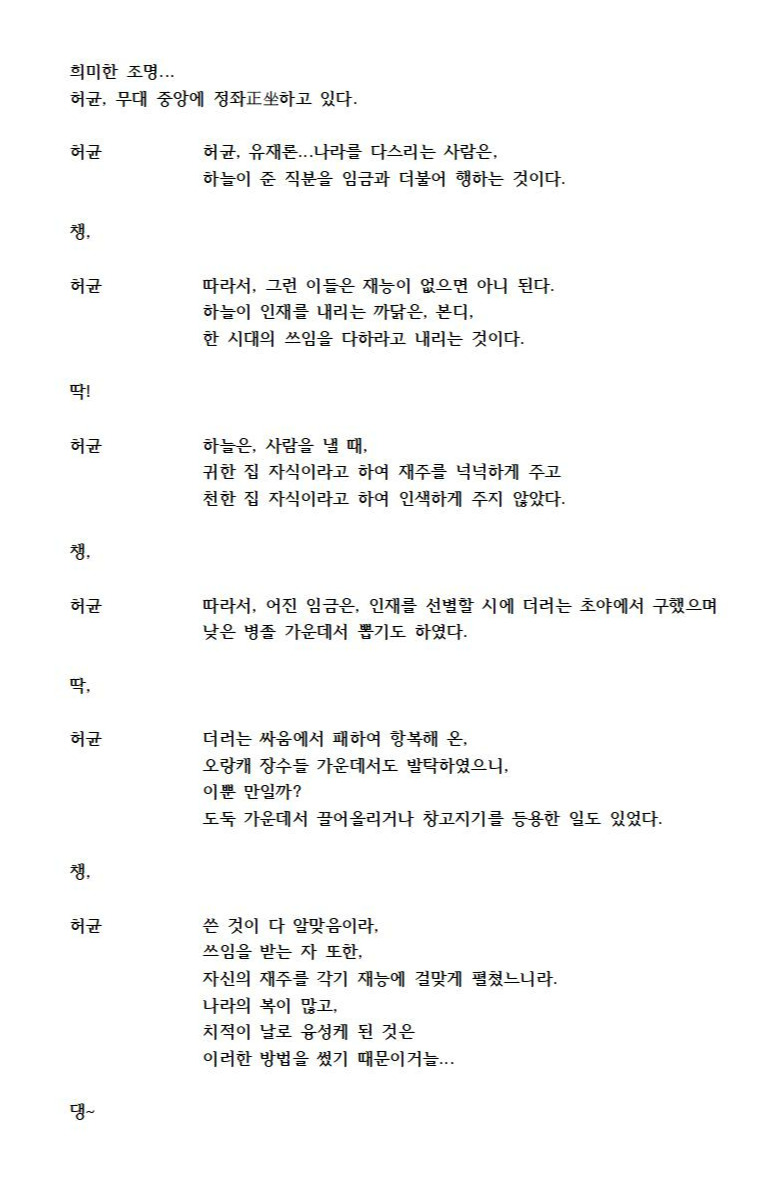 그래, 이 장면만큼은 꼭 작품에 넣어야겠다. 허균이 자신의 정치적 사상인 유재론을 말할 때마다, 종소리, 북소리, 징소리 같은 류의 효과를 살짝살짝 넣어줘야지. 그리고 유재론을 말하고 나서 오늘날 조선의 현실을 한탄하는 대사도 추가해야겠다.