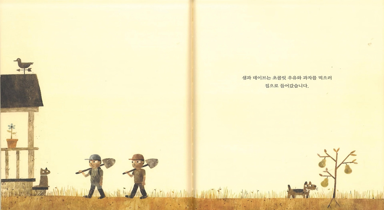 그리고는 초콜릿 우유와 과자를 먹으러 집으로 들어가는 샘과 데이브...