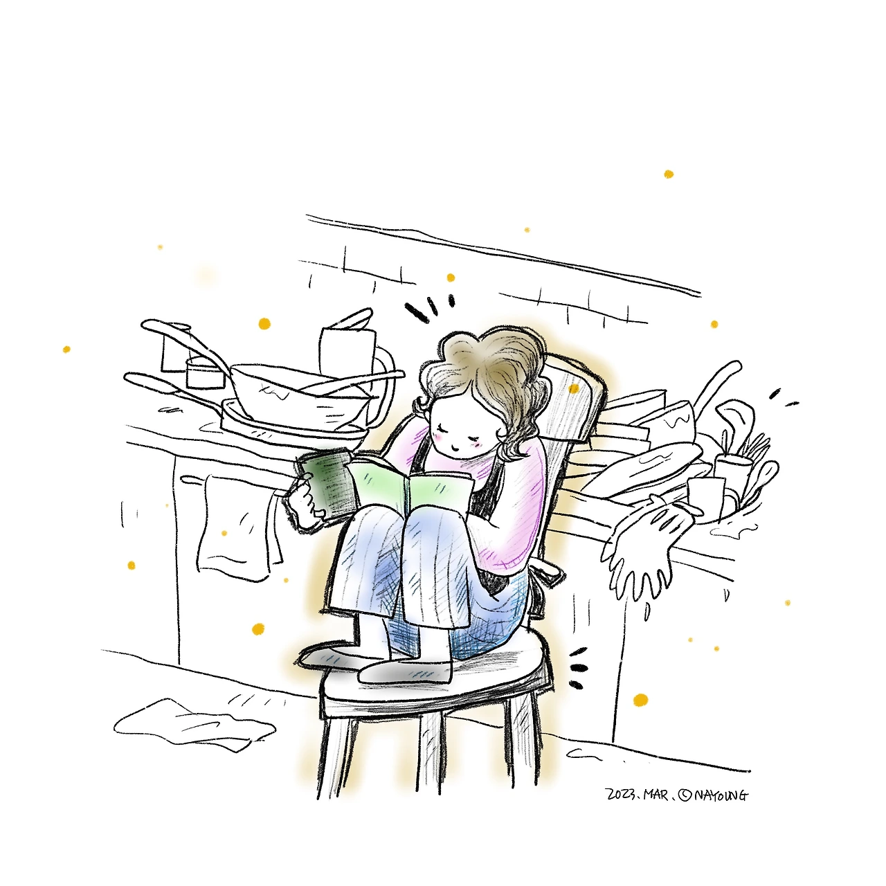 설거지를 개수대 안에 가득 쌓아둔 채로 책상에 앉아 커피를 마시며 책을 보다니...