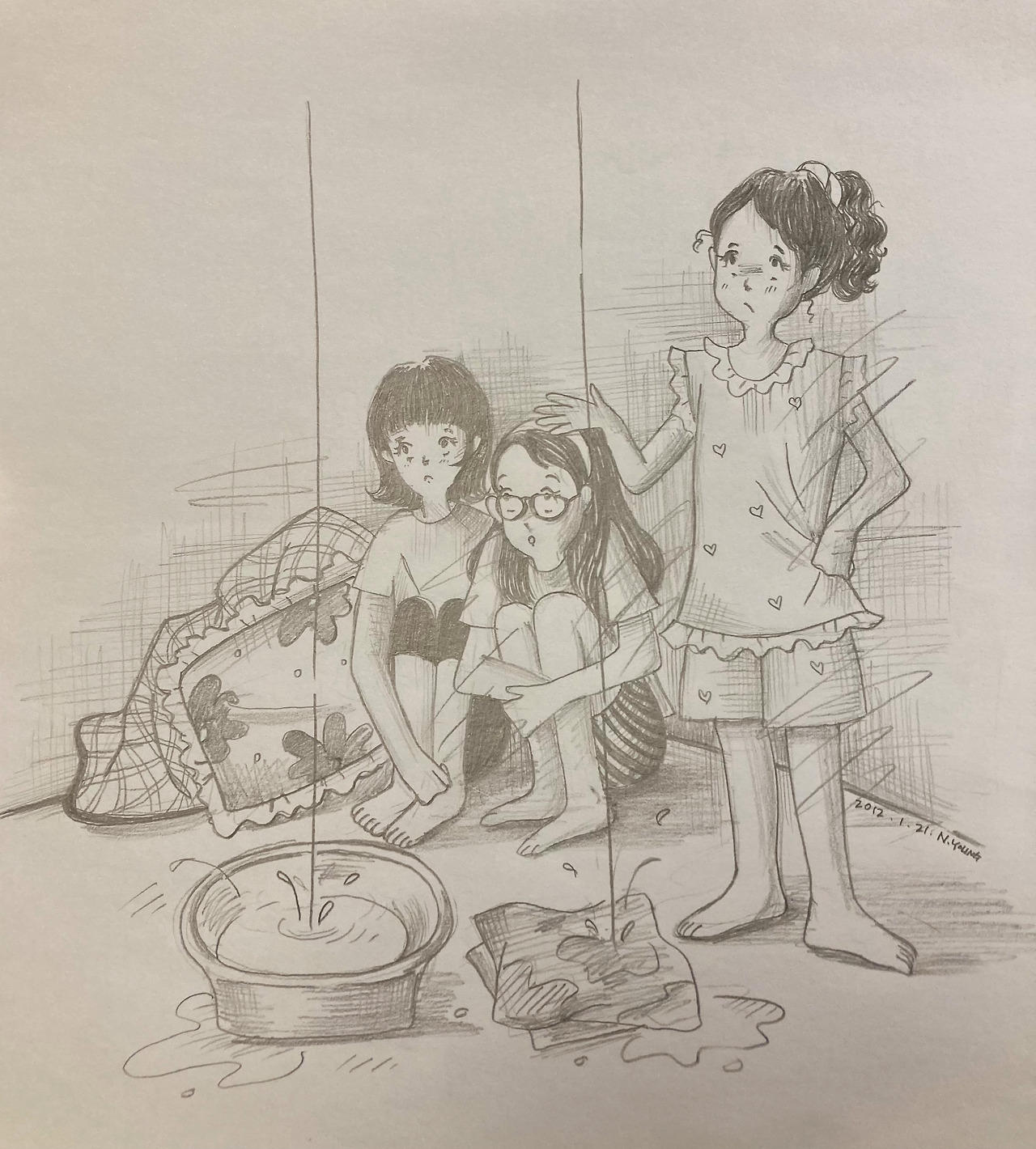 다급하게 여학생들의 방 문을 열고 들어갔더니, 야속한 빗방울이 하필이면 방 가장자리도 아니고 한가운데로 뚝뚝 떨어지고 세 명의 여학생은 이불이 젖을까 바짝 껴안고 벽에 붙어서는 불안한 눈으로 우리를 올려다보고 있었다. 한참을 걸레로 닦기도 하고, 양동이를 받쳐 보기도 하고, 그러다 빗 줄기가 더 굵어지니 도리 없이 우리 방 문을 두드렸던 것이다.