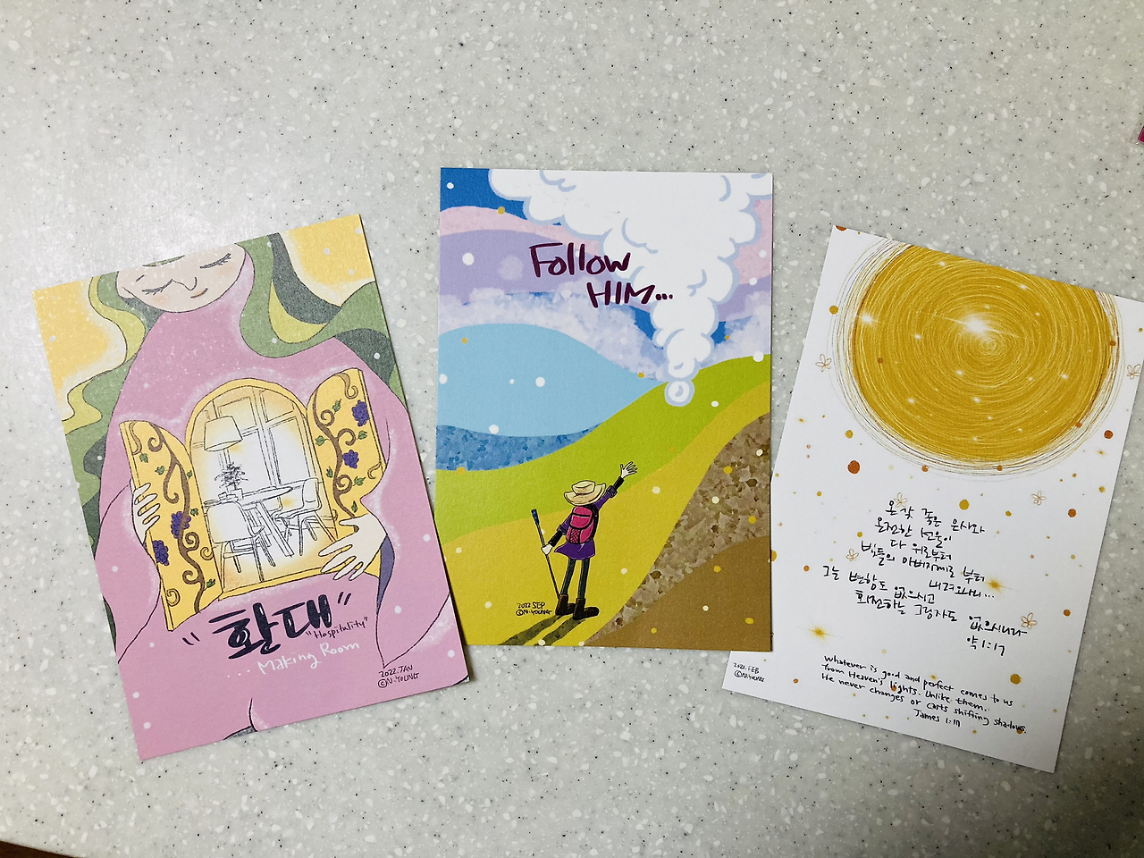 나와 어떤 면에서는 비슷한 길을 걸어왔고, 어떤 면은 앞으로 내가 걸어가고자 하는 길을 먼저 걸어간 면이 있어 더욱 마음이 통했고 서로의 이야기를 공감할 수 있었다. 아주 오랜만에 만났지만 한 뼘의 간극 없이 함께 살아온 것처럼 이야기를 나누고 서로 맞장구를 치면서 평소보다 더 빨리 흐르는 시간을 야속해했던 그날, 나는 언니를 위해 내가 그린 그림으로 만든 엽서를 선물했다.