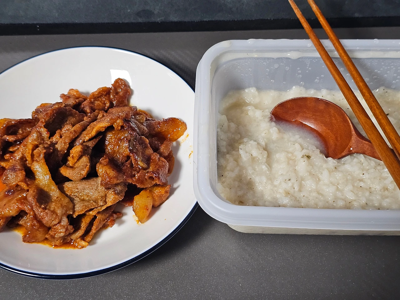 저녁도 고추장 불고기와 어제 먹다 남은 전복죽.