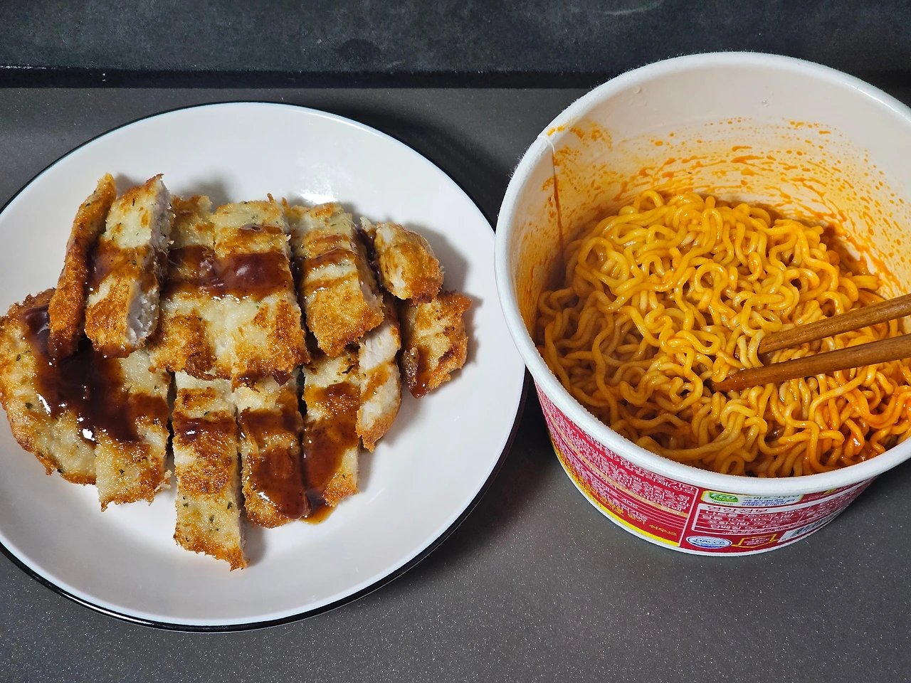 퇴근 후 편의점에 들러 스파게티를 사가지고 와서 집에 도착하자마자 돈가스를 튀기며 저녁 준비를 했다. 돈가스가 맛있게 튀기길 바라는 마음으로 불온도 낮추며 속까지 잘 익도록 튀긴 결과 아주 맛있는 돈가스가 내 눈앞에 놓이게 되었다.