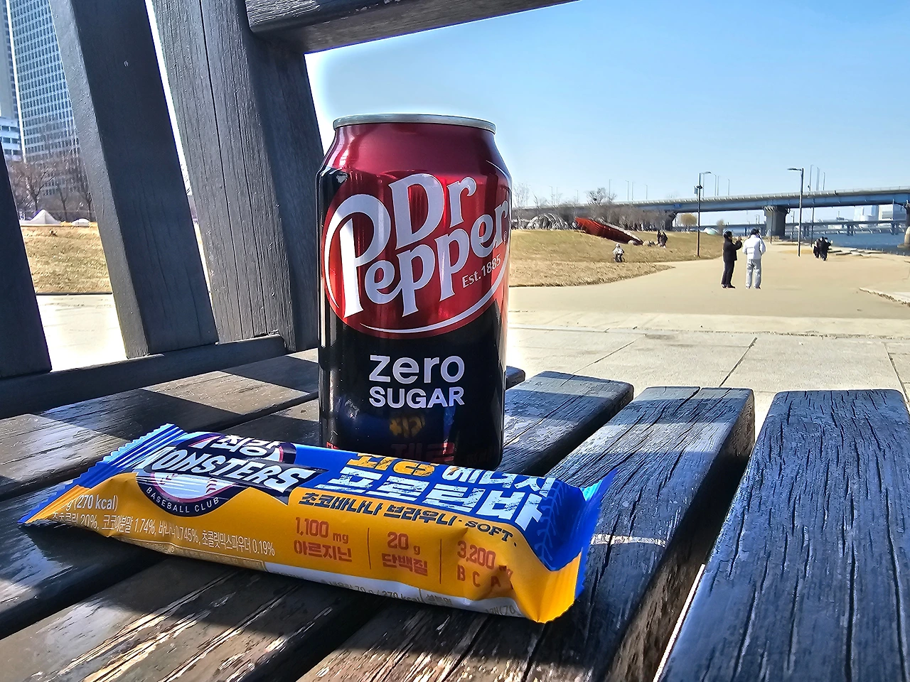 후다닥 편의점에 들어가 맥주를 보니 한 캔에 5000원 하는 거 보고 바로 맥주는 포기. 이를 대체할 체리콕콕과 함께 나의 단백질을 채워줄 프로틴바를 사서 벤치에 앉았다. 이렇게 사서 5000원인게 안 비밀.