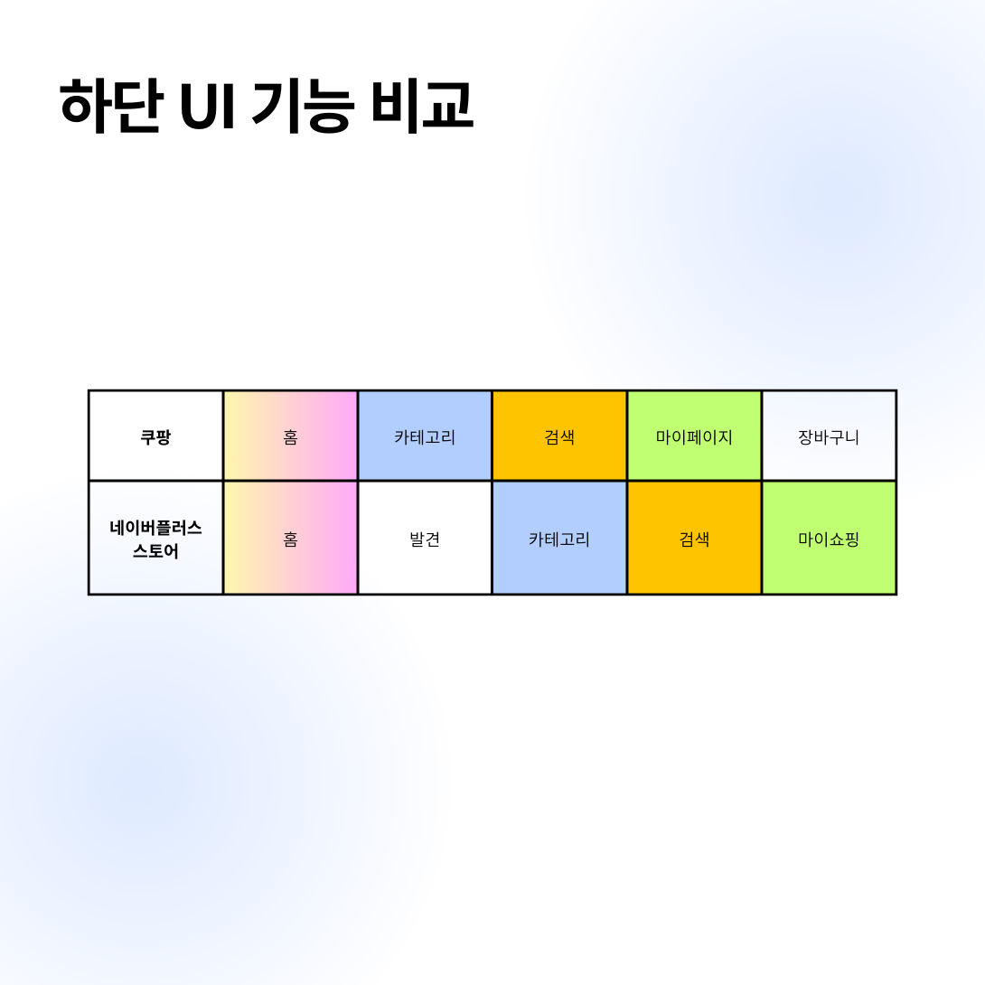 UI를 보기 쉽게 표로 구성해보았다. 동일한 기능은 같은 색상으로 구분하여 시각적으로 쉽게 비교할 수 있도록 하였다. 홈, 카테고리, 검색, 마이페이지(마이쇼핑)과 같은 기능은 동일하게 구성되었지만, 한 가지 차이점이 있었다. 쿠팡의 경우 5번 탭이 장바구니로 구성되어 있고, 네이버플러스 스토어의 경우 2번 탭이 발견으로 구성되어 있다. 따라서 하단 UI 비교는 장바구니와 발견을 중심으로 비교를 해보려 한다.