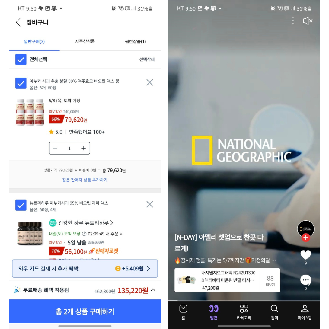 이번에는 각 서비스의 하단 탭 중 ‘장바구니(쿠팡)’와 ‘발견(네이버)’ 화면을 중심으로 디자인적 표현 방식과 사용자 시선 흐름을 비교해보려 한다.