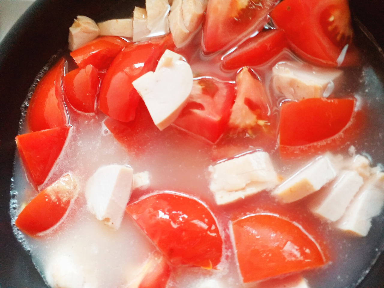 1. 토마토, 닭가슴살 잘라서 팬에 담고 물 붓고 끓인다.