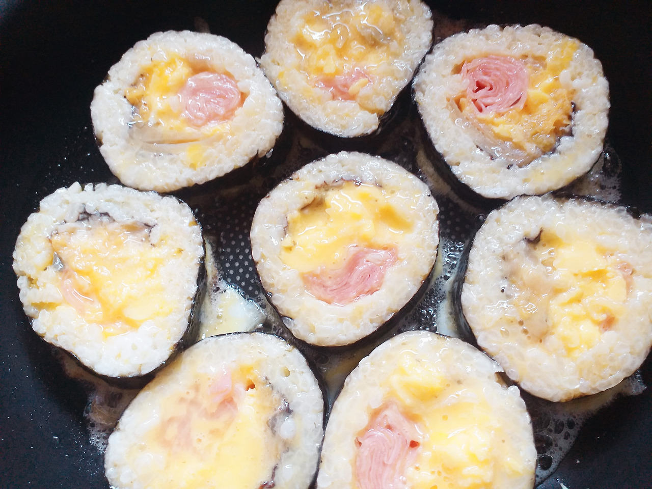 1. 계란 풀어 김밥에 묻혀 부친다.