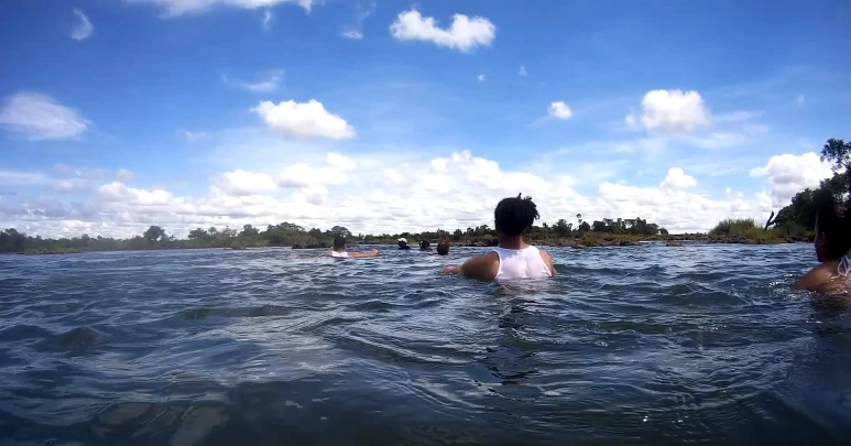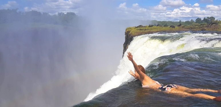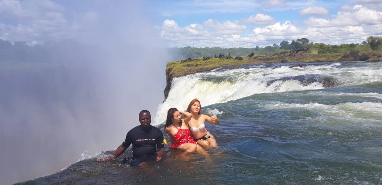 리빙스턴 아일랜드에서 악마의 수영장 포인트로 가기 위해서는 헤엄을 쳐서 물을 건너야 했다. 여기서부터 현타가 오기 시작. 이유는 물살에 휩쓸리면 바로 빅토리아 폭포 벼랑 밑으로 떨어지기 때문이다^^ 물론 내가 물에 떠내려가면 직원이 어떻게든 구조하겠지만, 그래도 정말 무서웠다. 설상가상으로 나는 개헤엄만 할 줄 알았고, 속력이 나지 않아서 물에 자꾸 휩쓸리는 것이 을매나 스릴 넘치게요...^^