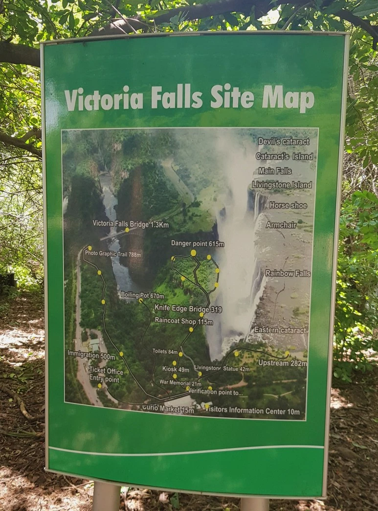 잠비아 빅토리아 폭포 국립공원 입장료는 20 USD. 국립공원 입구 쪽에 있는 내부 지도를 살펴보는데 갑자기 우리를 향해 누군가가 다가왔다. 공원을 안내하는 직원으로 추정되는 사람이었다. 그는 공원 한 바퀴를 함께 돌며 가이드를 해주겠다고 제안했다. 팁으로 실랑이를 벌이기 번거로워서 우리는 괜찮다고 했다. 하지만 그는 가이드 없이 들어갈 수 없는 포인트가 있는데 그곳이 아주 멋지다고 하기에 안내를 맡기기로 했다. (으이그, 이 팔랑귀)