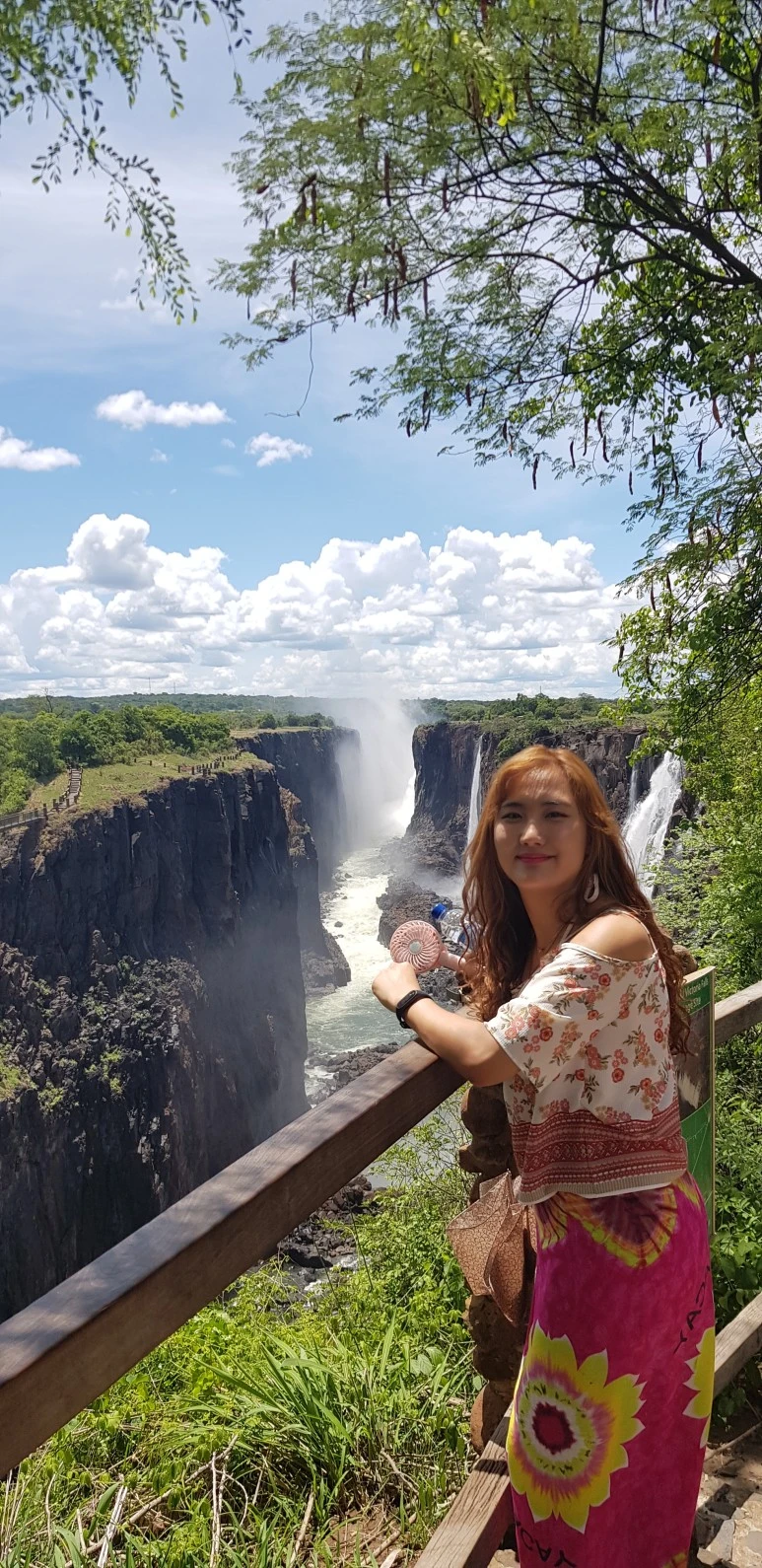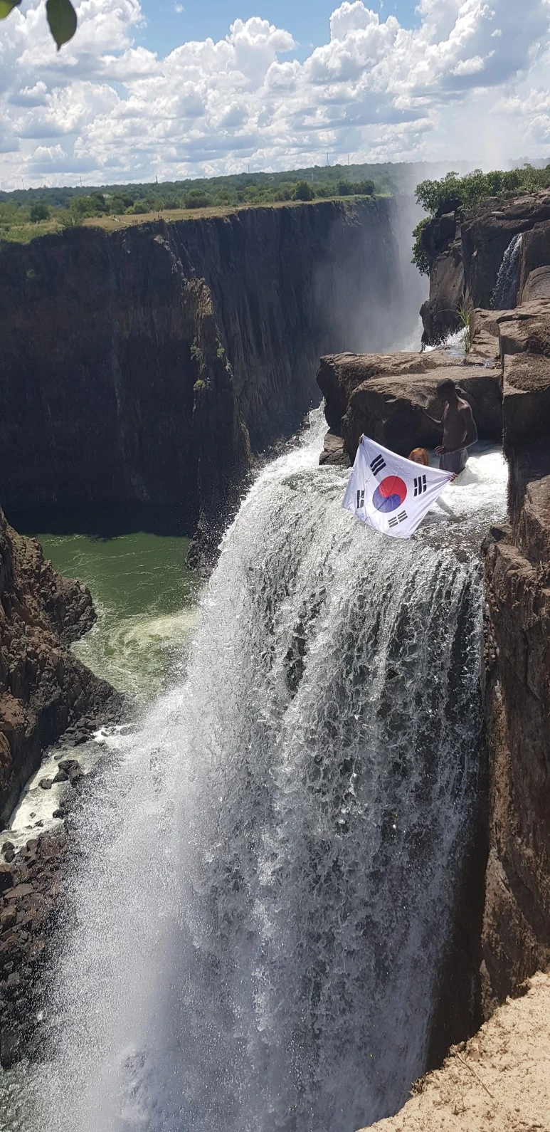 가이드는 저 폭포 바로 위 물웅덩이에서 촬영하면 사진이 굉장히 멋있게 나온다고 했다. 그러나 내 머릿속에는 온통 ‘요절’과 ‘객사’ 두 단어밖에 떠오르지 않았다. 잠시 고민을 하다가 일단 도전해보자 싶어서 겉옷을 벗고 물에 들어갔다. 폭포 바로 위라서 그런지 허벅지 정도 깊이의 급류에 들어가도 물살이 너무 거셌다. 가이드의 지시에 온전히 의지한 채 포토존으로 서서히 나아갔다. 벼랑 끝으로 가면 갈수록 물살이 거세지면서 휩쓸릴 것 같았다. 가이드는 벼랑 끝으로 나아가다 보면 바닥에 푹 꺼진 구명이 있을 거라며 그 안에 다리를 집어넣으라고 했다. 엄청난 공포와 싸우는 중이어서 정신이 없었지만, 천천히 발을 뻗으니 정말 다리가 쑥 들어가는 곳이 있었다. 물살과 싸우며 천천히 나머지 몸도 집어넣으니 가슴높이 정도의 수심인 구멍에 내가 설 수 있었다. 물살은 거셌지만, 구멍 안에 서 있으니 버틸 만했다. (다녀와서 알게 된 사실. 저곳은 정식 투어로 진행하는 곳이 아니며 단톡방에서도 위험하다며 추천하지 않는 곳이라 합니다.)