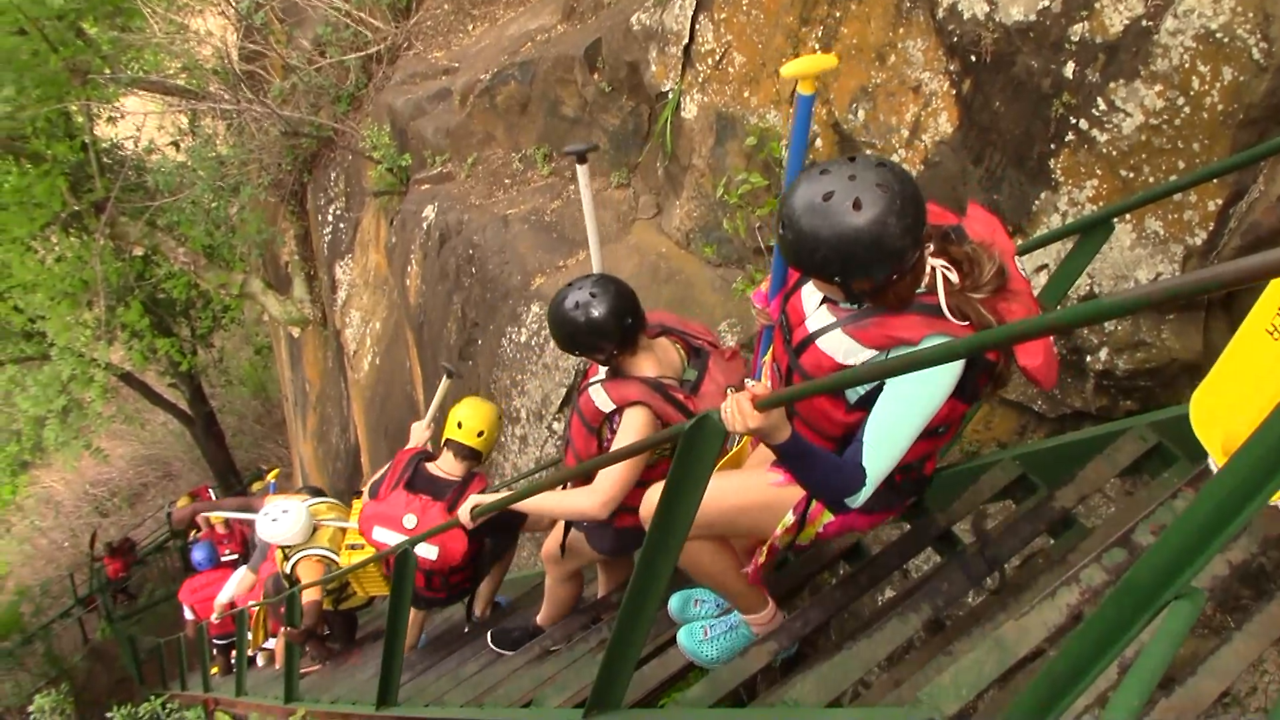 노를 받은 우리는 가파른 계단을 따라 계곡 아래로 내려갔다. 꽤 무거운 노를 들고 깎아지는 듯한 경사로를 내려가려니 다리가 후들거렸다. 부실하고 폭이 좁은 철제 계단은 래프팅을 시작하기도 전, 엄청난 긴장감을 안겨주었다. 이 와중에 스텝들은 무거운 보트를 들고 계단을 여유 있게 내려가셨다....!!