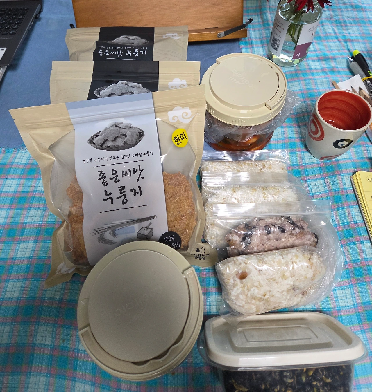 친구 어머니랑 아버님이 누룽지나 김치, 말려 작게 자른 미역 또는 다른 가공품들을 꾸러미로 해서 보내시는가 보다. 그 일을 가끔 이 친구가 가서 도와드린단다. 엄마랑 사이가 좋지 않으면서도 가끔씩 끊지 못하는 인연 덕에 가서 그 일을 도와드리고 있으니까 언니는 그냥 받아도 된다며 보내준 거였다. 내가 있는 동안 제주에 두 번이나 다녀갔기에 내가 어찌 지내는지를 잘 알고 있으니까 김치를 보내주고 싶어 했다. 그 어머니도 여기저기 많이 나누시는 덕에 김치를 넘치게 많이 얻으시니까 부담 없이 받아도 된다고 하면서. 어머니가 손수 담지 않았어도 평소에 자주 나누신 그 손길과 마음 덕에 돌고 돌아온 거니 결국 그분이 보내주신 것과 다름없다.