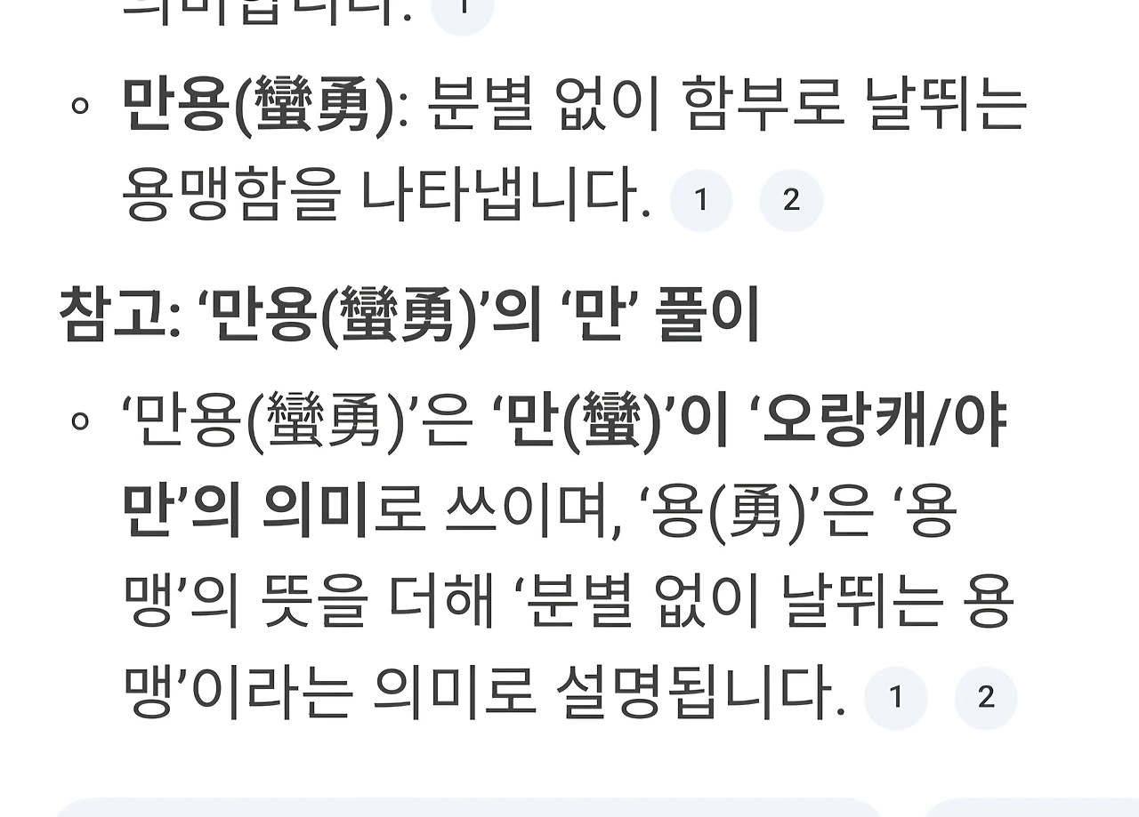 중국이란 커다란 땅덩이도 우리나라에선 오랑캐로 부르기도 한 만족의 집합체로 볼 수 있지 않던가? 수많은 종교들이 가톨릭, 불교, 기독교 외엔 이단 취급 받는 것처럼. 오랑캐는 여기에도 저기에도 있고 심지어 내 마음속에도 충분히 있다. 그 오랑캐 마음을 내어 용기로 만드는 데에는 오랑캐 만(蠻), 대추나무에 연 걸리듯 많은 입이 벌레 취급했던 마음을 뒤집어 보기만 하면 된다. 한 관점을 내던지는 마음이 물론, 쉽지는 않다. 그러기에 용기는 만용을 거스르는 다른 기운을 내어야 완성이 되는 것이고 만용을 뒤집을 힘이 필요하다. 책임이 따르는 일임은 물론이다. 하지만 재밌지 아니한가? 만용이 종이 한 장 차이로 용기가 되는 이야기.