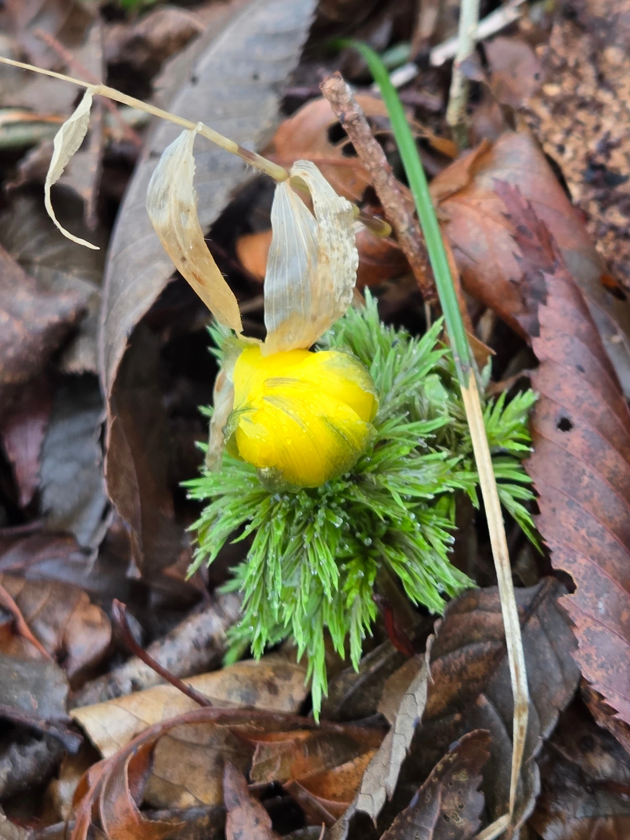 복수초를 향하여 한걸음 한걸음. 얼마나 보고 싶던 복수초 군락지였던가. 작년 3월 24일 우진제비오름에 대한 기록을 남겼으니 그 전날쯤 갔을 법하다. 친구가 살고 있는 집 근처라 몇 번 올랐던 곳인데 그 시절에 복수초와 노루귀, 산자고 군락지까지 한 목에 만났던 충격이 너무나 산뜻했던 곳. 조천에 사는 이 하나가 복수초 보러 갈 거라는 말에 퍼뜩 기억을 떠올렸다. 2월 10일. 복수초가 보이려나, 과연? 긴가민가하며 혼자 오른 우진제비 오름에는 복수초가 한 톨도 피어나지 않았었다. 피어나기는커녕 털옷 입은 얼굴조차 흔적 없었다. 너무 서두른 설렘이었으려나. 간신히 기다렸다 지난 25일 그곳을 다시 찾았다. 역시 두근거리는 마음 안고 가파른 시작점을 쉬엄쉬엄 올랐다. 이슬비가 간간이 내리는 날이었다. 그 사이에 뽈쏙뽈쏙 얼굴을 들고 있는 복수초 한두 녀석이 봉오리를 열 준비를 하고 있는 게 아닌가. 아아... 연인을 저 앞에서부터 발견해 설레는 마음이 이러려나? 활짝 핀 녀석은 없었지만 물오르는 나무들 숨결을 공기 중에 만지듯 느낄 수 있었다.