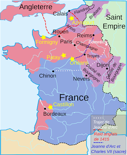 오) 당시 프랑스 영토 (파란색 - 프랑스/ 분홍색 - 영국/ 보라색 - 부르고뉴) 왼) 샤를 7세를 알현하는 잔다르크