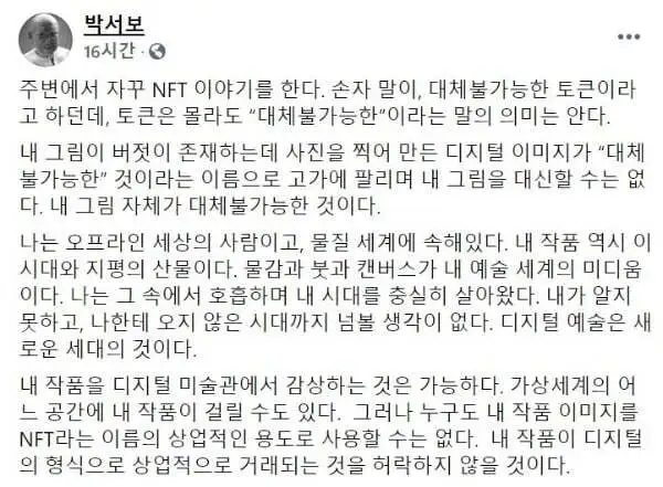 최근 미술계에서는 NFT 열풍이 불고 있다. NFT에 대한 평가는 엇갈리지만 현재 그 열기가 뜨거운 것은 사실이다. 작가들 뿐만 아니라 갤러리들도 작품을 NFT로 만들어 판매하고 있다. 인기 작가들에게는 작품을 NFT로 만들자는 제안이 쇄도할 수밖에 없을 것이다. 현대 미술의 거장 박서보 선생에게도 이런 제안은 있었나 보다. 박서보 화백은 한국 현대 미술에서 빼놓을 수 없는 인물이다. 단색화의 거장인 그의 작품 가격은 한 점당 10억 원을 호가한다. 예술의 세계에서 돈 이야기를 꺼낸다는 게 낯부끄럽지만 그만큼 NFT시장에서 그의 작품에 대한 관심은 높을 수밖에 없는 것도 현실이다. 그런 그가 자신의 작품을 NFT로 만들자는 제안을 단호하게 거절하며 SNS에 올린 글이 화제였다. 그의 글을 덧붙인다.