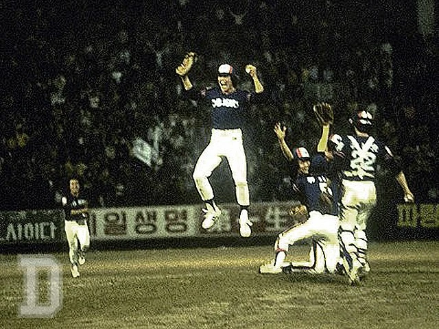 베어스 팬이라면 한 번쯤은 봤을, 아니 수도 없이 봤을 영상. 바로 원년 한국시리즈 최종 6차전에서 OB 베어스가 우승을 확정하는 장면이다.