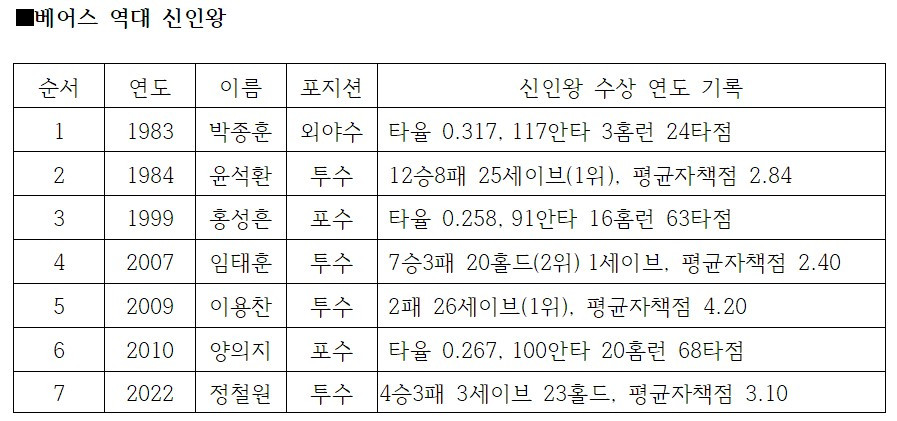 베어스는 지금까지 총 7명의 신인왕을 내놓아 가장 많은 신인왕을 배출한 구단으로 자리매김하고 있다. 그래서 ‘신인왕의 산실’로 불리고 있다. 윤석환을 비롯해 역사적 인물들은 추후 다시 조명을 하기로 한다.