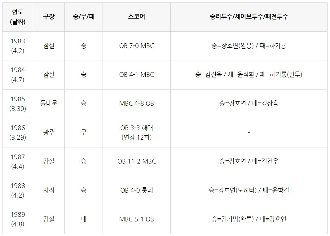 그러나 승부는 이것으로 끝이었다. OB 베어스의 1-5 패배. 베어스는 1983년부터 1988년까지 개막전에서 한 번도 지지 않고 6전 5승1무를 기록 중이었다. 개막전만 되면 파죽지세였던 OB 베어스 역사에서 처음으로 생채기가 난 패배였다(베어스의 개막전 전적이 1983년부터 집계되는 것은 [베팬알백] <11편>에서 설명한 바 있다. 간단히 설명하자면 1982년 원년 개막전은 삼성 라이온즈-MBC 청룡전으로만 펼쳐졌기 때문이다).