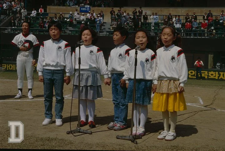 1989년 개막전에서 애국가를 부르는 어린이들. 왼쪽 뒤로 이광환 감독이 보인다. ⓒ두산베어스